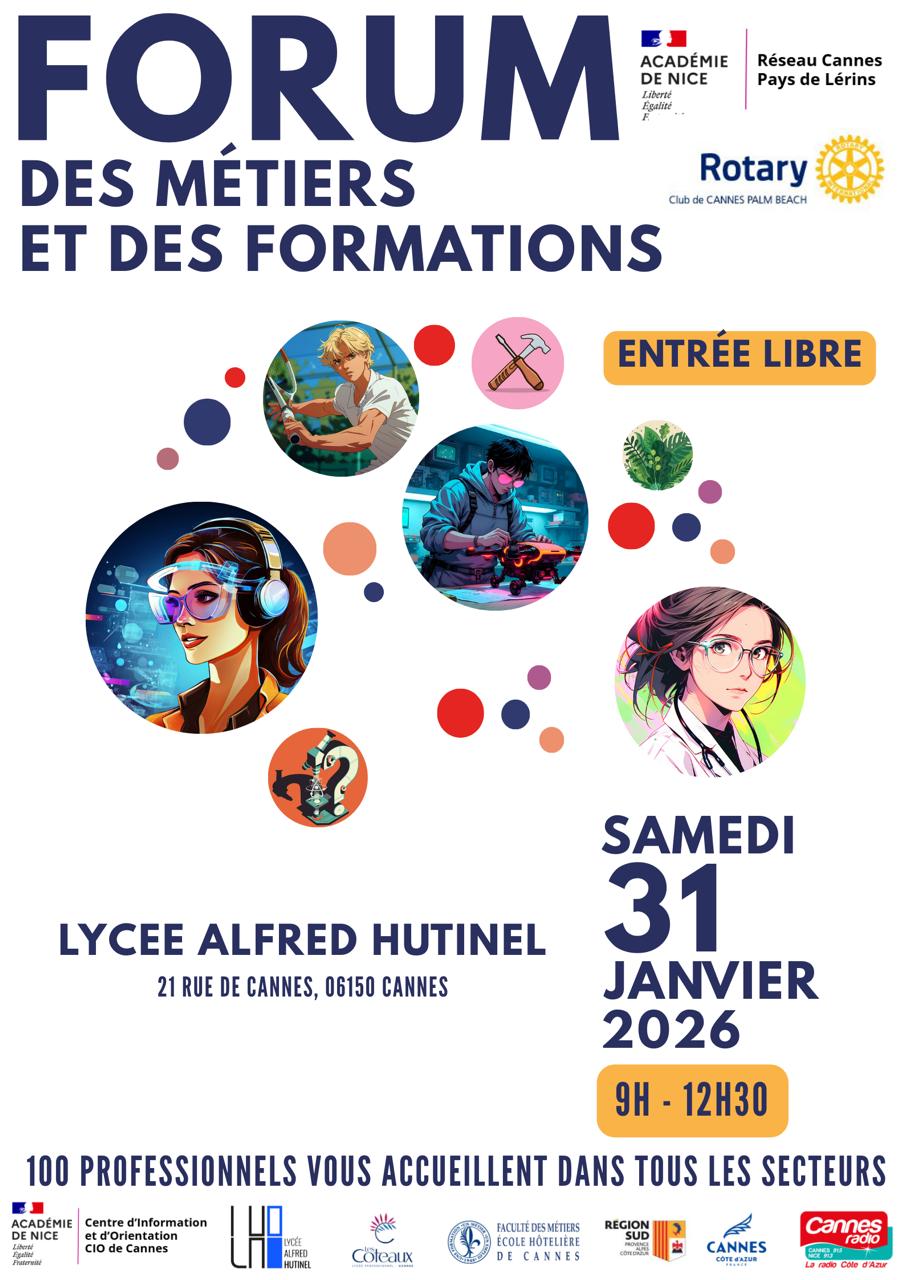 Ce 6ème Forum des métiers coorganisé par le Rotary club Cannes-Palm-Beach permet aux collégiens , lycéens et leur famille de rencontrer individuellement des professionnels pour parler de façon concrète de leur métier dans de nombreux domaines d'activité.